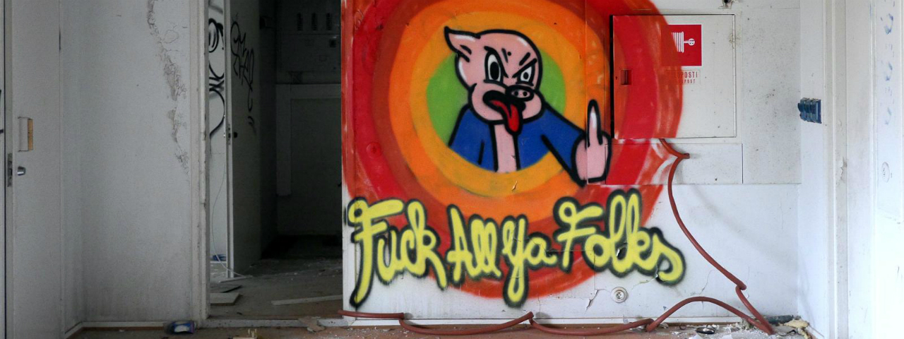 Fuck All Ya Folks on graffitia, animaatiota ja lisättyä todellisuutta. Se on katutaideanimaationäyttely, joka yhdistää popkulttuuria ja splatteria vakaviin aiheisiin. Syömishäiröinen Nalle Puh ja hakattu Halinalle näyttävät sarjakuvamaailman ideaalien raadollisen puolen. Todellisuus, ei kovinkaan usein vastaa illuusioita, jonka sunnuntaiaamun fantasiat meille piirtävät.